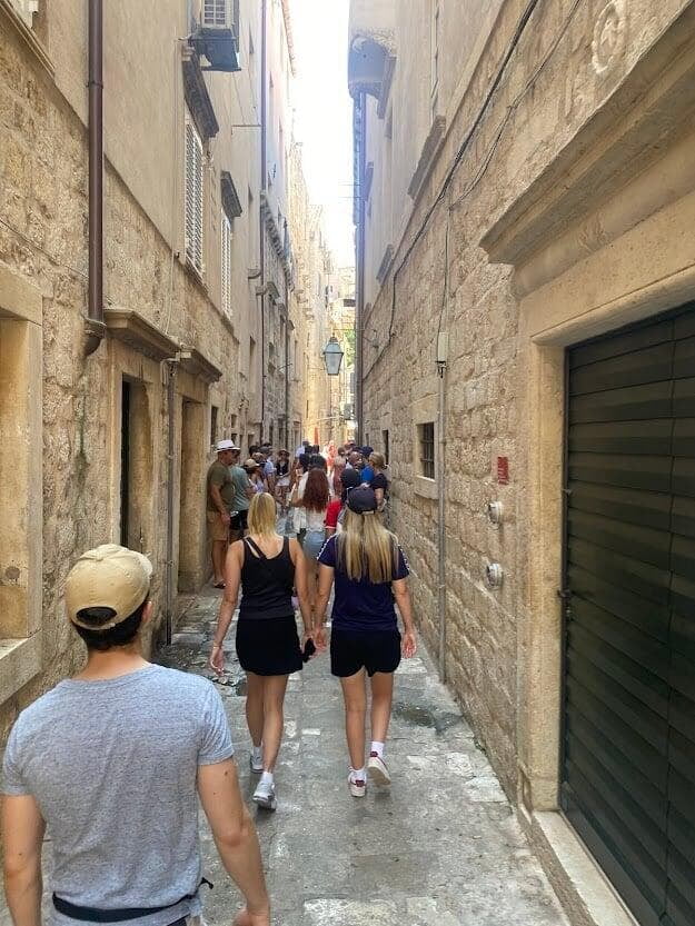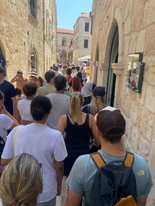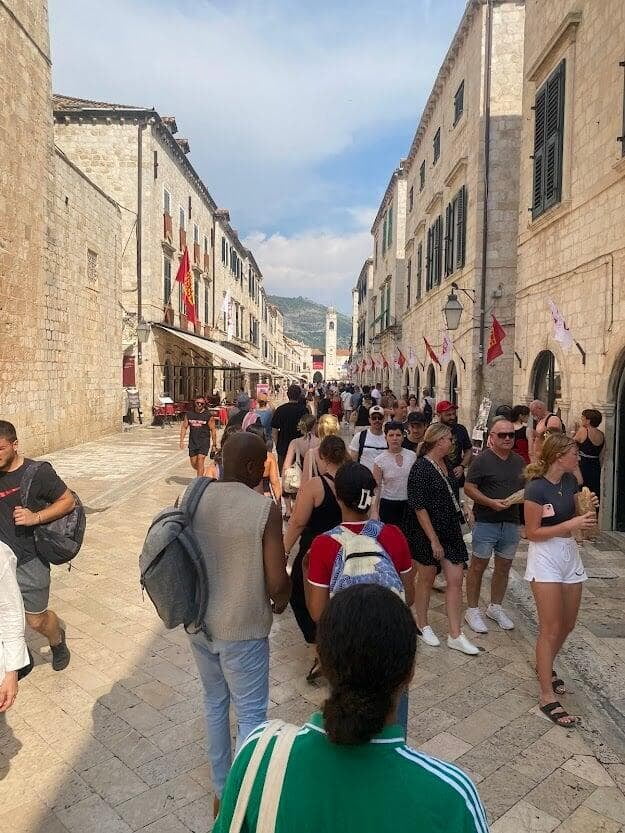 À Dubrovnik, rares sont les locaux dans les rues de la vieille ville, principalement envahies par les voyageurs du monde entier. Une conductrice de taxi nous a carrément avoué qu'elle évitait la vieille ville pendant l'été...Lorsqu'un ou plusieurs bateaux de croisière accostent, le surtourisme est clairement une réalité. Deux bateaux de croisière par jour. 4000 passagers dans chaque maximum. Emblématique du surtourisme, la ville croate de Dubrovnik, surnommée «la perle de l’Adriatique», rationne depuis 2019 les arrivées par la mer dans les ruelles de sa cité médiévale, submergées par les admirateurs de la série Game of Thrones.